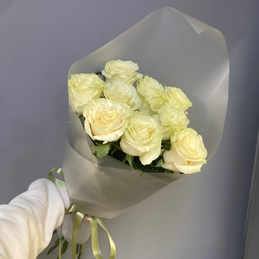 На фото букет из 9 белых роз. В составе: роза 9 шт, дизайнерская упаковка 1 шт, атласная лента 1 шт, . Все цветы свежие и ароматные, букет красиво оформлен и отлично подходит для подарка. Доступна доставка цветов или самовывоз.